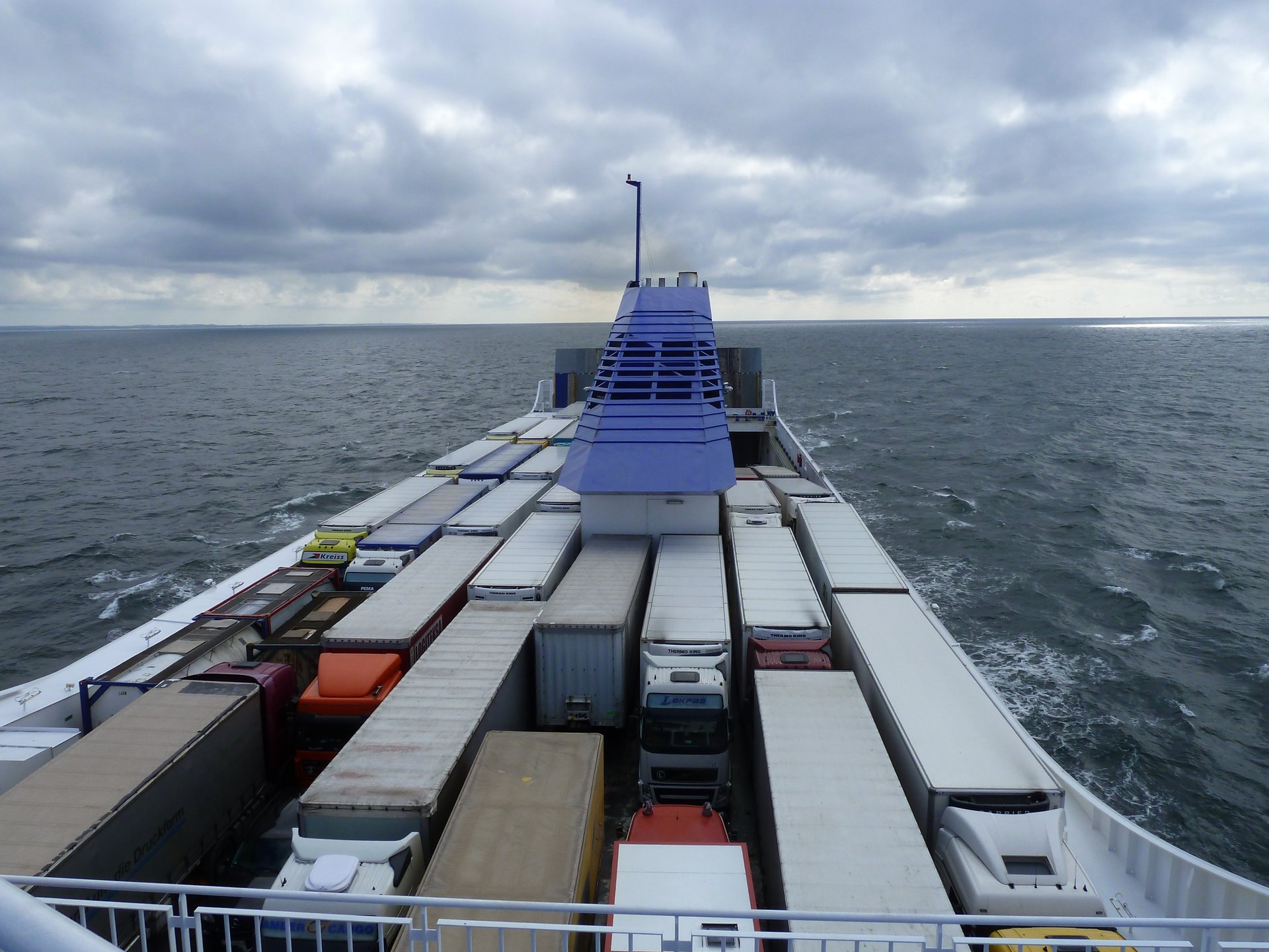 There are 25 minutes until the ferry check-in starts. The café in the harbor is already closed. It’s a pleasant sunny evening. In the distance, a large container ship is being unloaded, warships are visible across the bay. Our ferry is not in sight. The English pensioners with their caravan parked behind us come to chat. They’re coming from Estonia and going home.