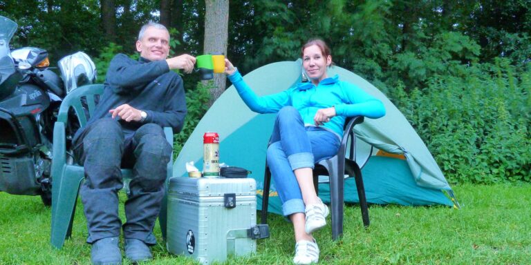 The campground wasn’t far away anymore. From the gas station we bought some food and drink to take along and soon we were there. The evening was pleasantly balmy, we sat in front of the tent and enjoyed German beer. Then we crawled into our new sleeping bags and had a nice sleep.